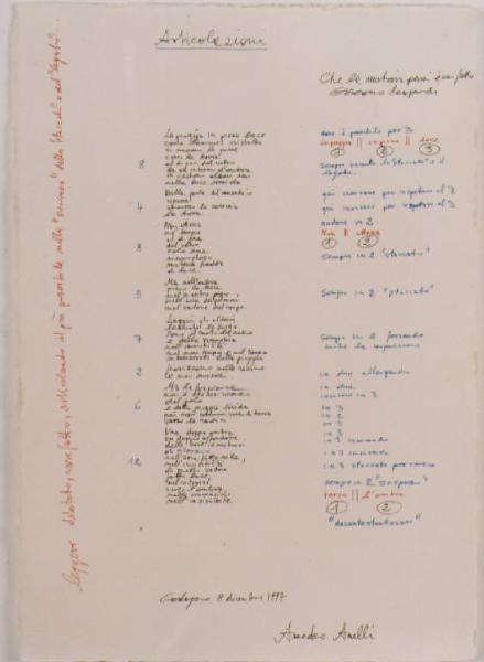 Composizione di versi in due colonne verticali. Segno scrittura corsivo, manuale.
