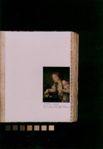 Su una pagina bianca di un libro aperto è riprodotto un dipinto con una adolescente che guarda un uccellino morto appoggiato ad un tavolo. Al di sotto sono riportati alcuni versi di Leopardi. Il colore è tonale e caldo. Il\nsegno scrittura è corsivo, manuale.