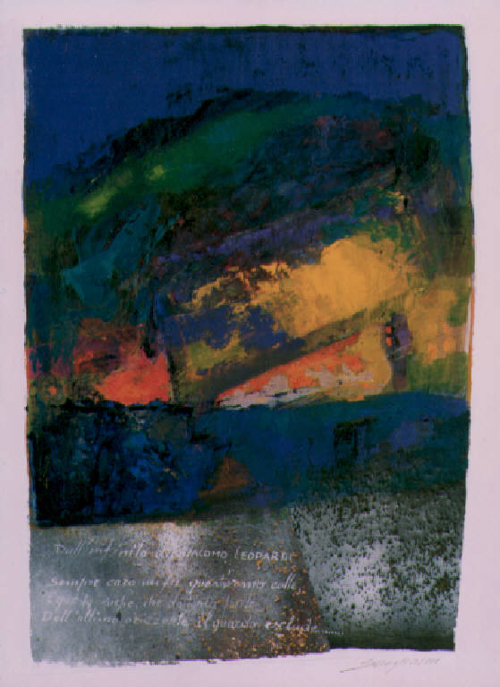 Composizione libera di forme cromatiche disposte secondo un andamento orizzontale. In basso al centro c'è una citazione da versi di Leopardi.\nIl colore è caldo (giallo, arancio), freddo (viola, azzurro). Stesura: stratificata; veloce. Segno scrittura (orizzontale , manuale).