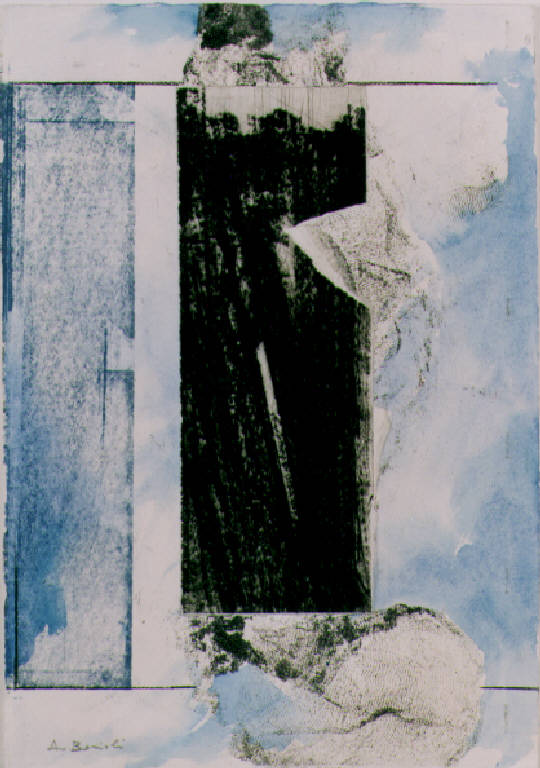 Lo spazio è diviso in tre zone verticali modulate con interventi segnici cromatici. Il colore è tonale, freddo (azzurro), acromatico (nero).\nStesura:stratificata. La linea è curva, ondulata, frastagliata. Struttura simmetrica.