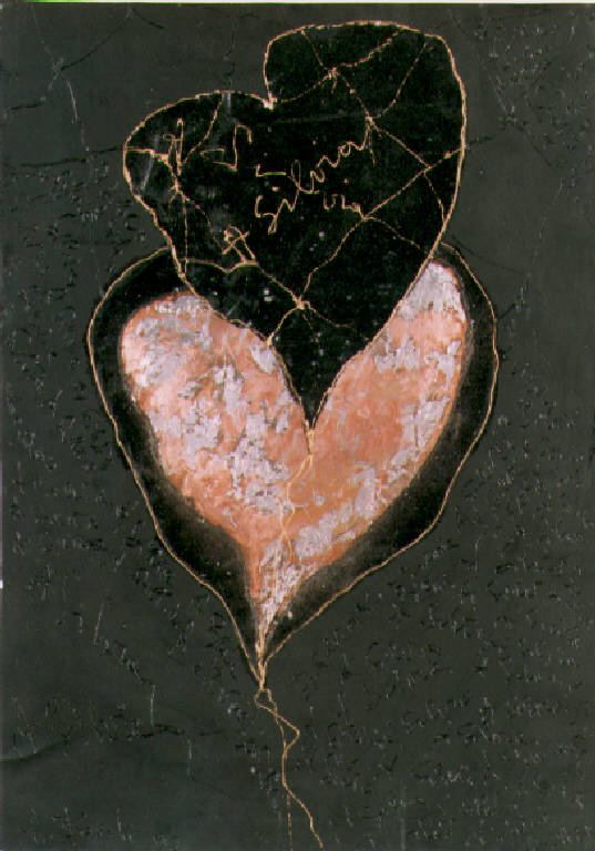 Due grandi cuori contrapposti cromaticamente e parzialmente sovrapposti ricordano la poesia "A Silvia". Il colore è acromatico (bianco, nero).\nLa stesura è sottile, modulata.