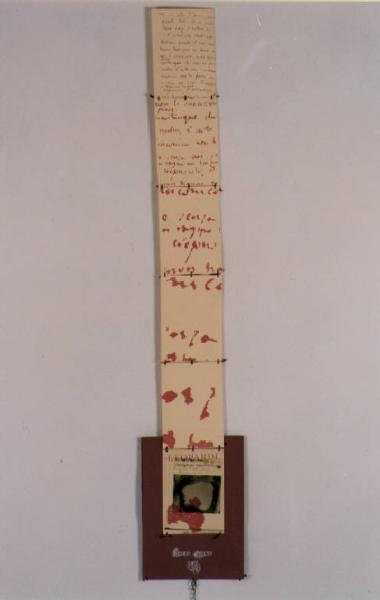 Segni-scrittura disposti obliquamente e orizzontalmente su una serie di forme aperte a fisarmonica. Il colore è caldo (rosso). Stesura: piatta.\nSegno scrittura è ondulato, orizzontale, ritmico.