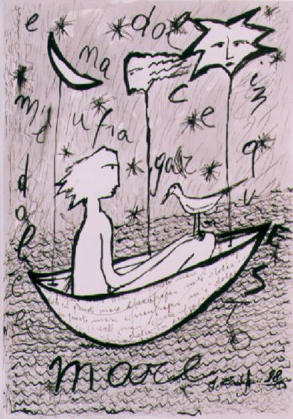 Al centro dello spazio compositivo una barca stilizzata porta una figura maschile con un uccellino sulle ginocchia. Tre aquiloni sono trattenuti dai bordi della barca. Segni e scritture muovono la rappresentazione.\nColore: acromatico (bianco, grigio). Stesura: piatta. Le linee sono grosse, contornanti. La scrittura è manuale.