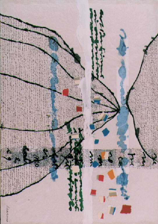Alcune linee e piccoli segni scrittura creano una forma appuntita che ricorda un colle. Il colore è caldo (rosso, giallo), freddo (azzurro, verde). La linea è grossa, continua, la scrittura è manuale.