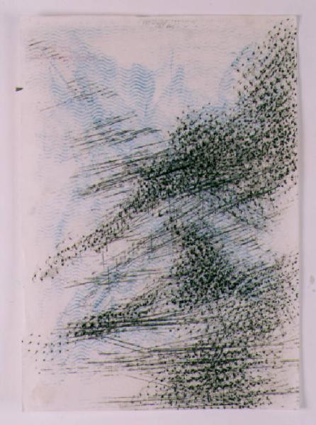 Segni, punti, macchie creano onde in movimento dense di variazioni luminose. Il colore è freddo (azzurro). La stesura è veloce; variata.\nLa linea è frastagliata.