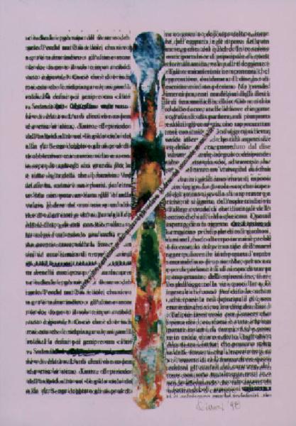 Al centro di due colonne con scritte orizzontali emerge una forma verticale ottenuta con macchie di colore e collage. Il colore è caldo (rosso, giallo); freddo ( verde, azzurro). I segni scrittura sono orizzontali, a stampa.