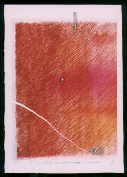In uno spazio compositivo aperto tratteggiato, con contrapposizioni di luce e ombre si evidenzia partendo dal basso una linea obliqua, e due elementi a rilievo in centro e in alto. Il colore è tonale, caldo (rosso, arancio).\nStesura: a rilievo. La linea è frastagliata, veloce, continua.