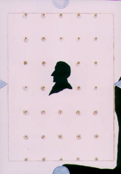 Opera a collage in cui il profilo di Leopardi è posto al centro di uno spazio bianco regolarmente disposto secondo un andamento lineare.\nIl colore è freddo (azzurro) e acromatico (nero).
