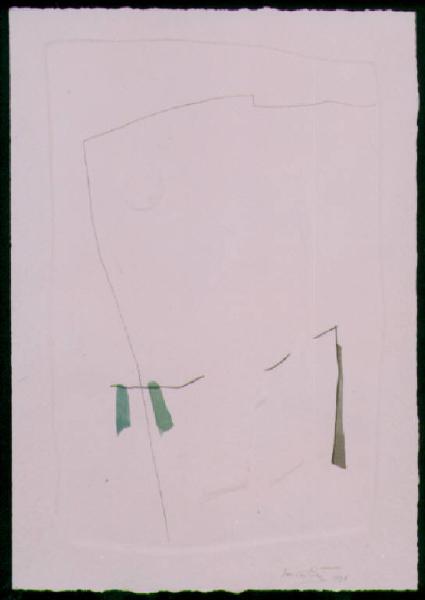 Al centro dello spazio compositivo emerge un rettangolo a rilievo con segni a calco e piccole bandiere fluttuanti. Il colore è freddo (verde) e la stesura è a rilievo. La linea continua.