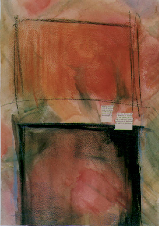 Due rettangoli neri vuoti occupano l'intero campo espositivo mosso da un colore caldo e tonale. La stesura è modulata, nervosa, frammentata. La linea è sottile e grossa.