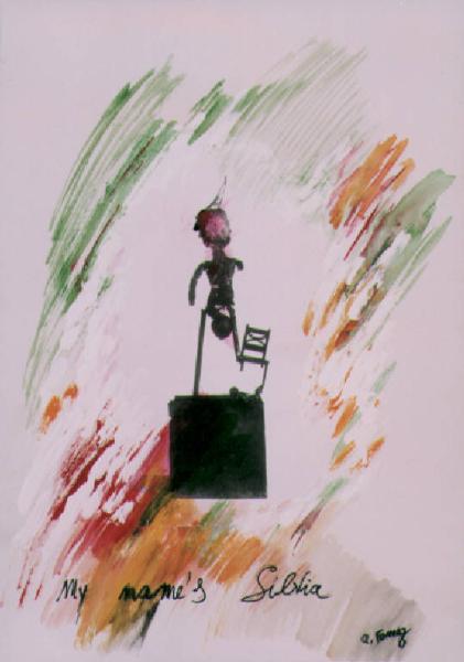 Una bambola rotta è collocata al centro su di una base; attorno lo spazio compositivo è reso fluttuante da una pittura materica e informale.\nIl colore è caldo (giallo, arancio) e freddo (verde). Stesura: stratificata.