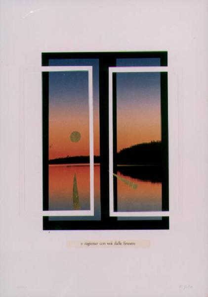 Al centro del campo compositivo è una finestra che dà su di un paesaggio lacustre preso al tramonto. Il colore è tonale e caldo (oro, giallo, arancio).