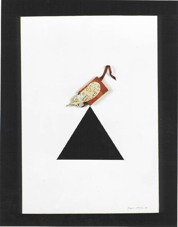 Al centro dello spazio bianco c'è un triangolo equilatero nero con libriccino alato al vertice superiore. Colore caldo (rosso). Vi sono alcuni segni scrittura manuali, sparpagliati.