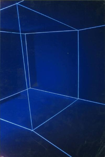 Stanza nera con fili elastici tesi in modo ortogonale che creano un nuovo spazio. Gli elastici son illuminati da luce u.v. e si allargano e si stringono modificando la percezione dell'ambiente.