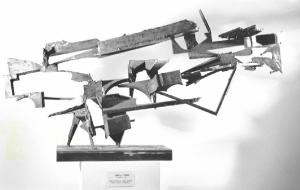 Opera a tutto tondo in ferro in alcune parti colorato di rosso. Piccoli elementi di ferro di forme e dimensioni diverse sono saldate insieme in modo tale che prevalga il vuot sul pieno.