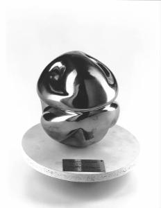 Opera sferica sagomata con alcuni incavi, ristretta a metà come se si dovesse scindere in due emisferi.