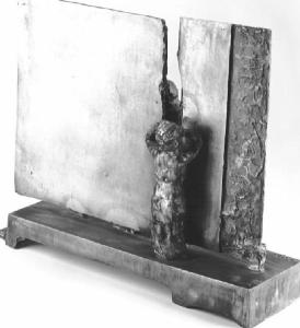 Opera a tutto tondo costituita da un muro con una fessura attraverso cui guardano due figure: una da una parte, l'altra, dall'altra.