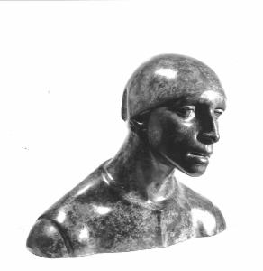 Busto a tutto tondo in bronzo che rappresenta il volto di una contadina.