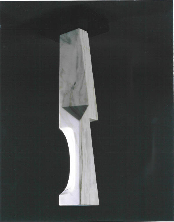 Opera a tutto tondo in marmo bainco con base in marmo nero; le venature del marmo seguono la lunghezza e sono un motivo decorativo. \nStruttura verticale con tagli netti e incavi definiti dall'andamento sinuoso o rigido per creare suggestivi giochi di luce e ombra.