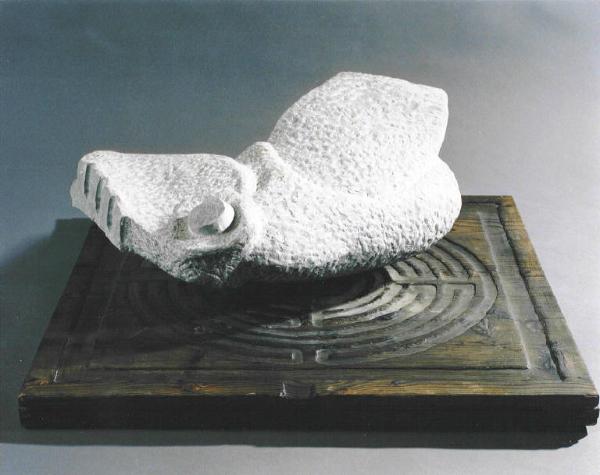Opera costituita da due elementi: una parte in marmo che rappresenta la testa stilizzata di un minotauro; una base quadrata in legno con disegnato al centro un simbolo geometrico.