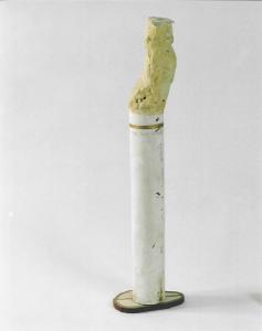 Opera polimaterica a tutto tondo a forma di sigaretta. Portacenere.