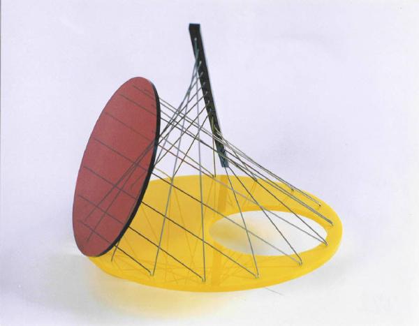 Opera a tutto tondo costituita da 4 pezzi di perpex due circolari gialli, uno circolare rosso e una bacchetta nera, i pezzi sono uniti da fili in acciaio.