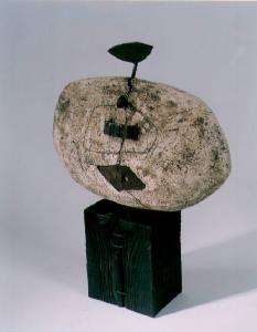 Opera polimaterica a tutto tondo costituita da una base cubica in legno sulla quale è posto un elemento ovale che sembra una pietra, decorata con elenti di ferro arrugginito.