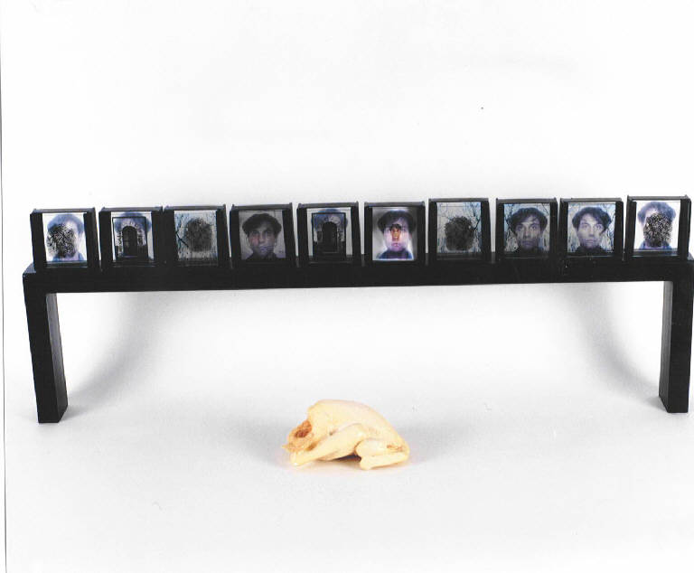 - NOTIZIE STORICO CRITICHE Installazione composta da 20 quadretti in ferro, vetro, fotografia e un pollo in gesso. Ambientale.