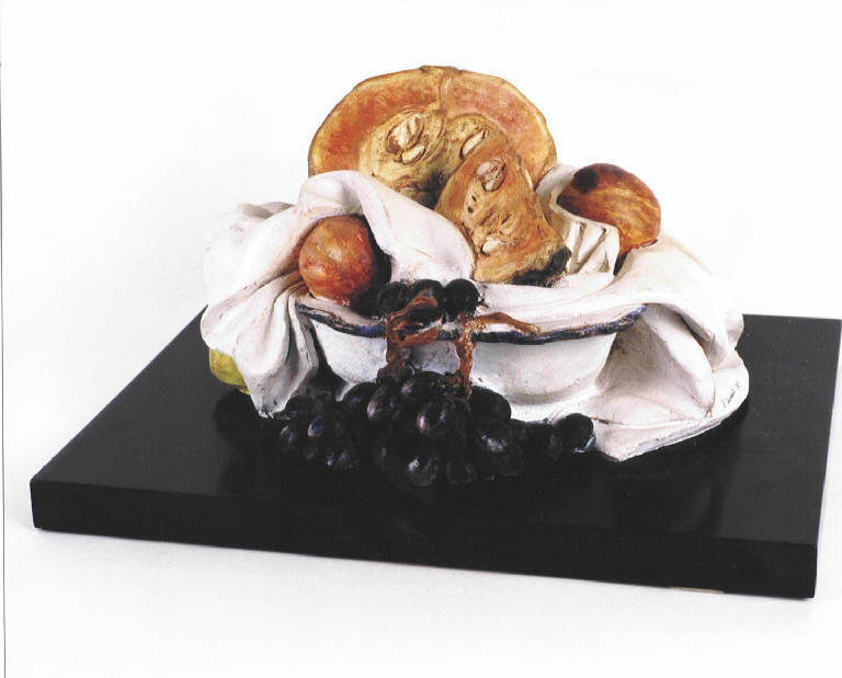 Opera a tutto tondo in ceramica policroma, rappresenta un canestro di frutta.