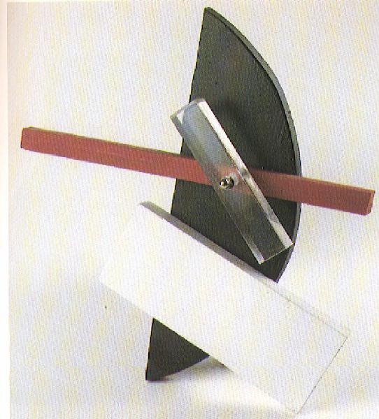 Opera polimaterica costituita dall'assemblaggio di 4 componenti. Su una tavola in legno nero a forma di mezza luna sono applicate due bacchette in plexiglas trasparente rosso e trsparente, e un elemento bianco in legno. I vari elementi sono uniti tramite una vite.
