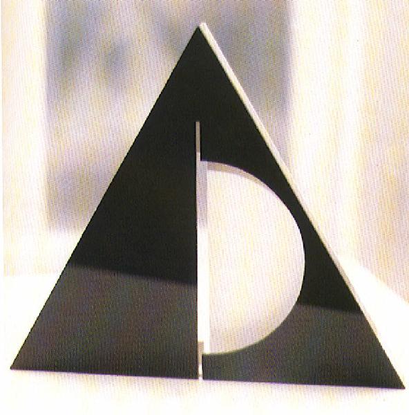 Opera costituita da due triangoli di colore diverso: uno bianco e uno nero. I due triangoli davanti presentano disegni geometrici intagliati in modo da far emergere il colore sottostante. es. sotto il nero si vede il bianco e viceversa.