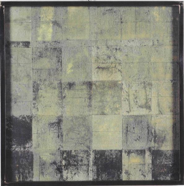 Opera costituita da frammenti piuttosto regolari di carta da vetro grigia, di varie tonalità e a volte non perfettamente integra.