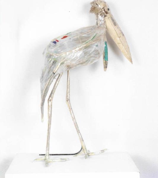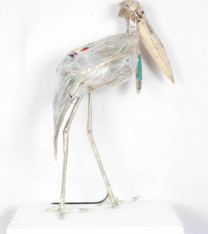 L'opera è costituita da uno scheletro di asticciole di legno prese dalle cassette della frutta e da un rivestimento in plastica e da altri materiali di scarto.