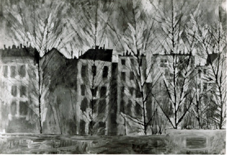 Opera a tecnica mista su carta con in primo piano alberi realizzati in china nera con un tratto molto sottile e definito, sullo sfondo una cortina di edifici.