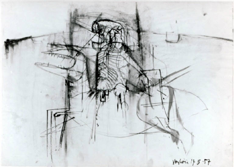 Opera a tecnica mista che rappresenta un'immagine molto stilizzata quasi fantastica che rappresenta un cavallo e un caveliere resi con tratti sottili e incisivi.