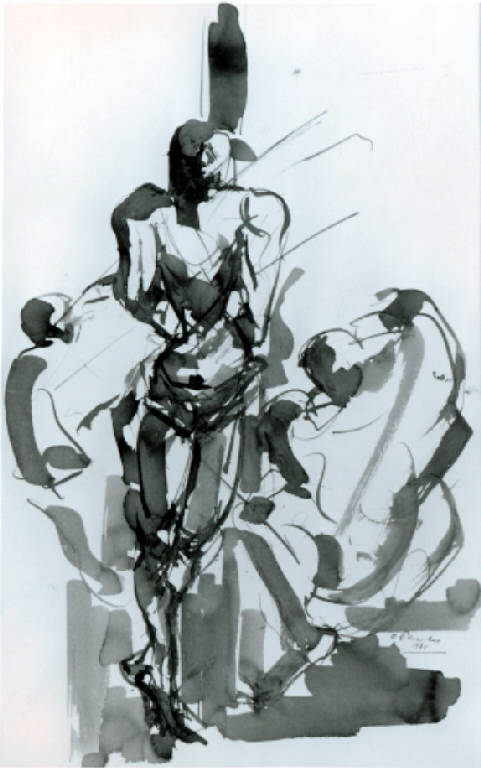 Opera su carta che rappresenta una figura maschile legata ad un palo e torturata mediante freccie (San Sebastiano); due figure ai suoi lati sono rese sinteticamente con rapidi tratti scuri.
