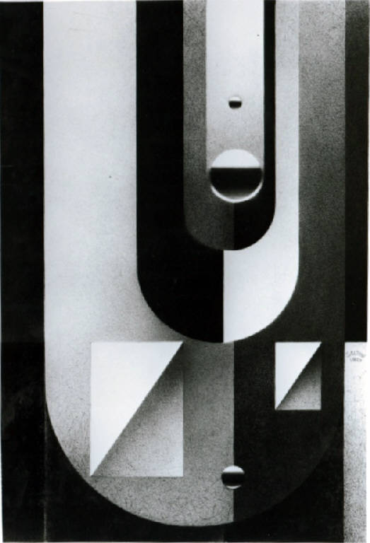 Opera in cui il campo compositivo è modulato da contrasti di luce e ombre; bianchi grigi e neri caratterizzano forme geometriche regolari ed irregolari.\n.