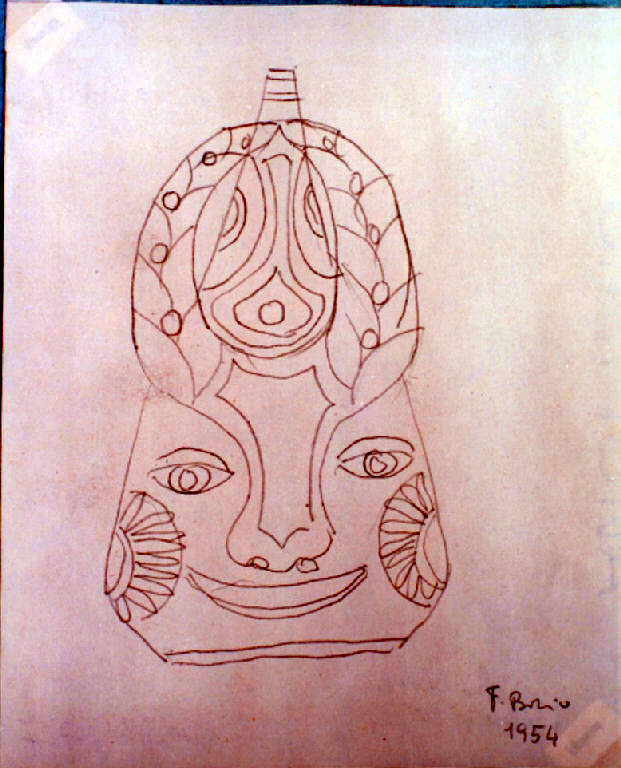 Disegno a matita di una brocca con viso. Nella parte superiore un intreccio di forme naturalistiche stilizzate che scendendo costutuiscono la forma di un naso. Alla base della brocca la bocca, gli occhi e la guance evidenziate da fiori.\n\n\n\n.