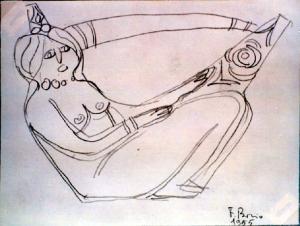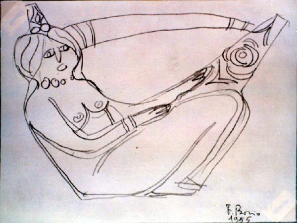 Progetto per una brocca con donna nuda seduta. Ha le gambe piegate e unite, indossa una collana e un bracciale al polso destro. Dalla testa parte una struttura va ad unirsi all'estremità opposta creando così un'impugnatura.\n\n\n.