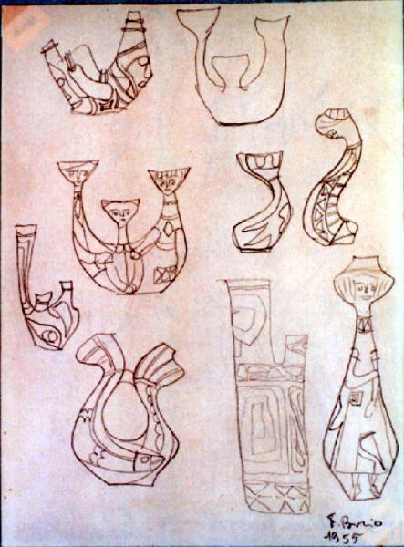 All'interno dello spazio compositivo si articolano su tre file nove disegni, realizzati a matita, di brocche dalla forma e decorazione antropomorfa differente. \n\n\n.