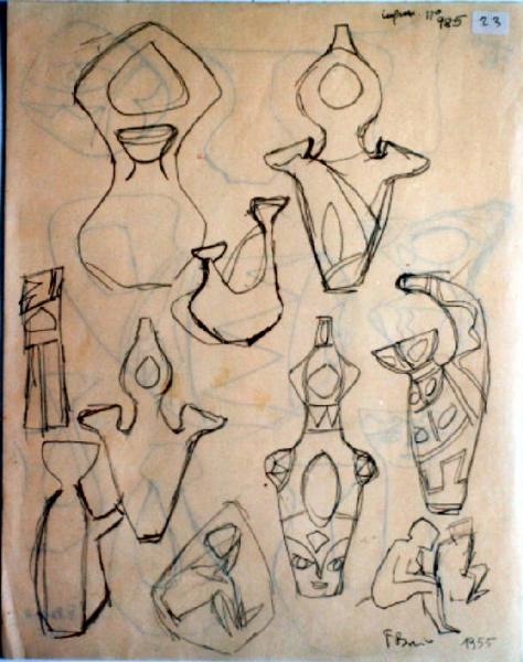 Foglio in carta con nove progetti per brocche di forme differenti e decorazioni costituite da forme geometriche irregolari e rimandi e figure umane. Nell'angolo in basso a destra schizzo di due piccole figure femminili sedute. \n\n\n\n\n.