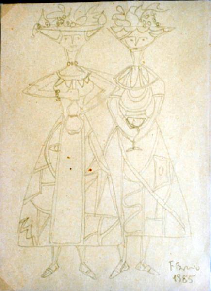 Disegno a matita di due figure femminili statiche e stilizzate che indossano stravaganti cappelli e lunghi abiti decorati da forme geometriche irregolari. Quella a sinistra tiene tra le mani una bottiglia mentre la sua vicina un calice.