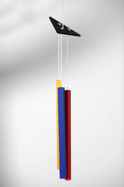 Opera costituita da 4 pezzi: uno a forma di triangolo di colore nero da cui partono tre solidi, un cilindro rosso, un parallelepipedo blu e un triangolo giallo. Questi elementi sono appesi, tramite una cordicella bianca Opera da appendere al soffitto, si muove con leggeri spostamenti d'aria.