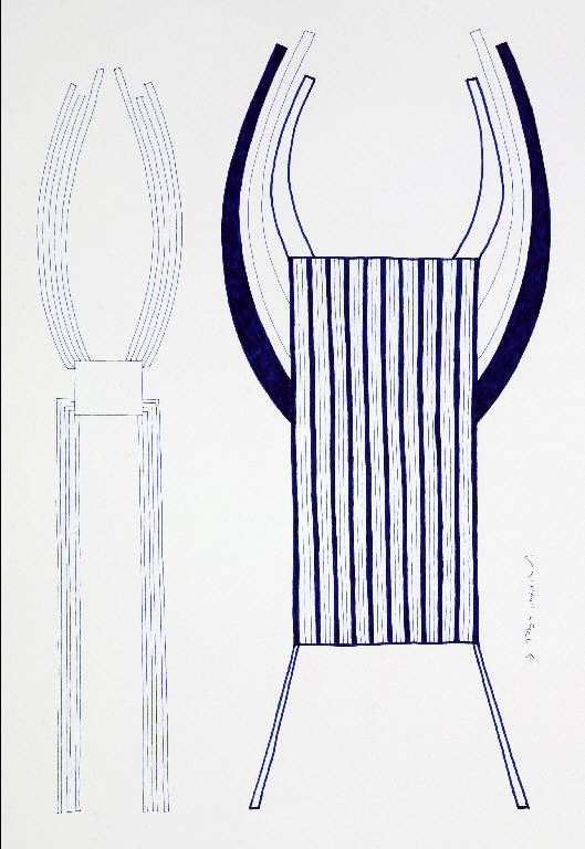 Composizione di forme astratte costituita da due elementi posti verticalmente il secondo dei quali risulta colorato di blu in alcune sue parti.