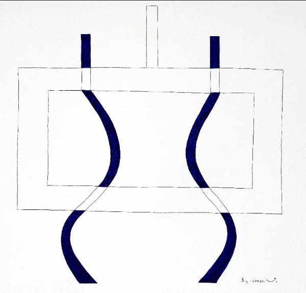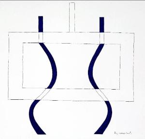 Composizione di forme astratte caratterizzata da due rettangoli sovrapposti attraversati verticalmente da due elementi curvilinei di colore blu.