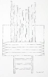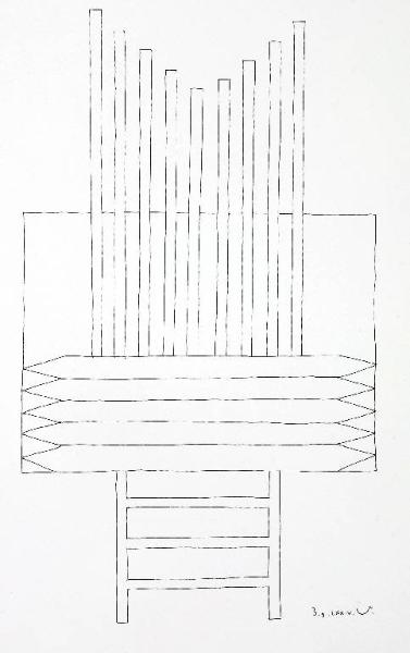 Composizione di forme astratte composta da piu' elementi verticali ed orizzontali con alla base una struttura simile ad una piccola scala .