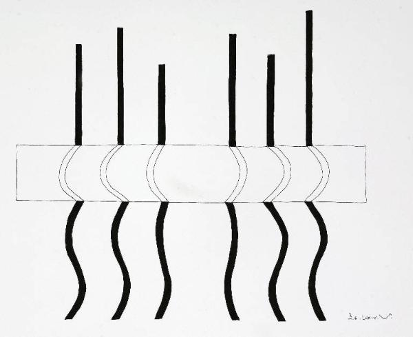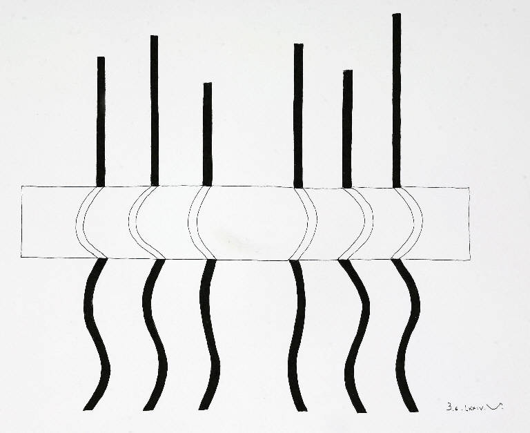 Composizione di forme astratte caratterizzata da uno stretto rettangolo attraversato verticalmente da sei elementi mistilinei di colore nero.