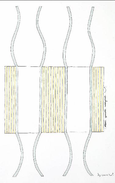 Composizione di forme astratte costituita da rettangolo caratterizzato da linee gialle al suo interno e attraversato verticalmente da quattro elementi mistilinei neri e verdi.