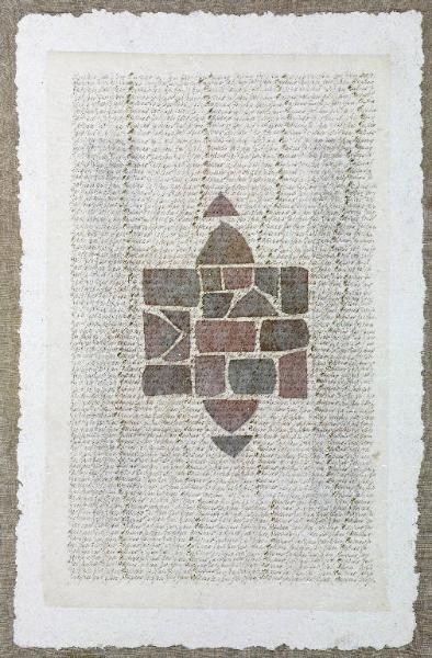 Opera caratterizzata dello stratificarsi dei materiali: su una tela di canapa un foglio di carta fatta a mano sul quale son applicati, al centro dello spazio compositivo, delle foglie che costituiscono una forma geometrica. Sopra questo, un foglio trasparente con scritte in corsivo, dall'andamento continuo scandito da piccole gocce d'oro che formano delle linee verticali ondulate.