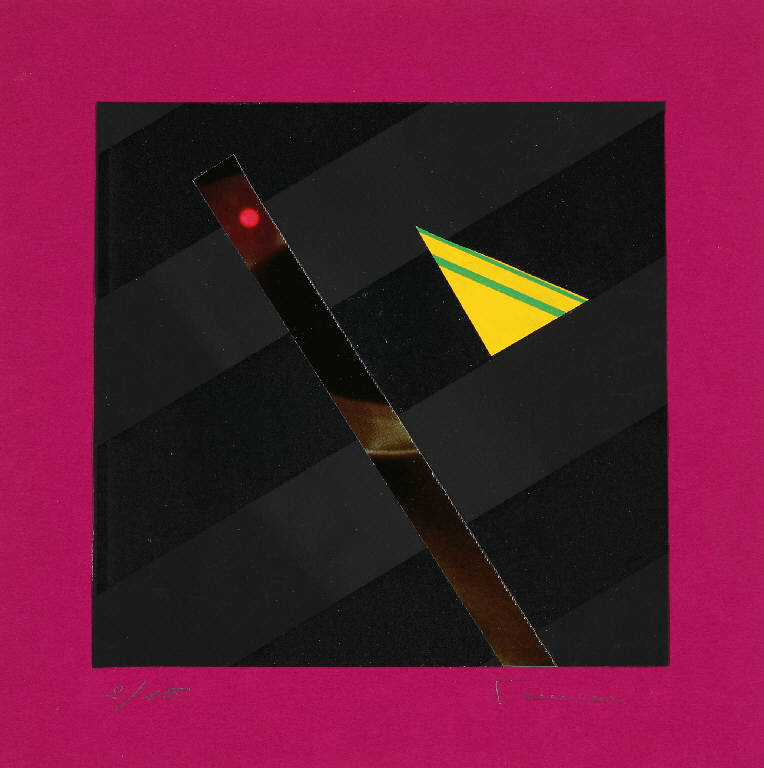 Composizione a collage di forme geometriche: un triangolo giallo e un trapezio irregolare su un quadrato nero su fondo ciclamino.